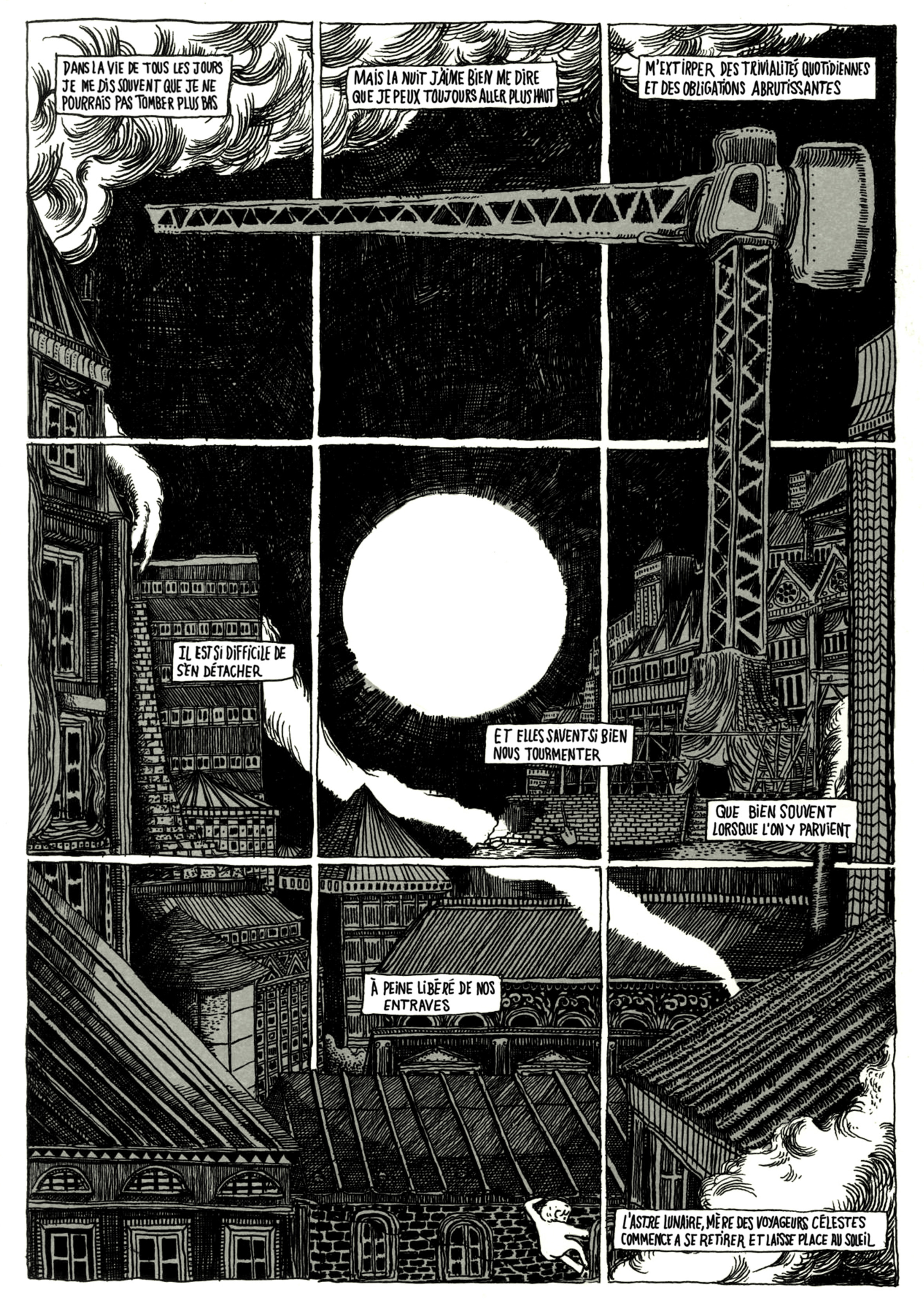 Cherchant à représenter ces instants fugitifs et si insaisissables, j’ai revu ces nuits où, au détour d’une porte dérobée ou de l’échelle d’une grue, on grimpe jusqu’à contempler la ville d’en haut, là où les sons n’arrivent plus.